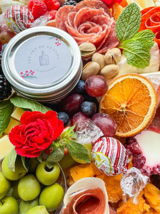 Ready for your holiday table! Charcuterie board for 15-18 with all the staples you know and love, plus plenty of festive red accents. 7 types of cheese, 3 salami roses, prosciutto, coppa, olives, cornichons, jam, honey, mustard, grapes, berries, nuts and crackers packaged on the side for freshness.