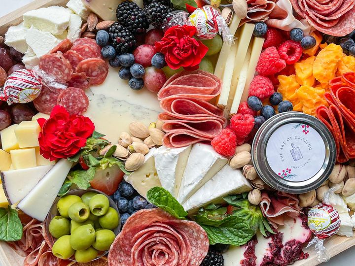 Ready-to-serve or gift! Charcuterie board for 15-18 with all the fixins. 7 types of cheese, 3 salami roses, prosciutto, coppa, olives, cornichons, jam, honey, mustard, grapes, berries, nuts and crackers packaged on the side for freshness.