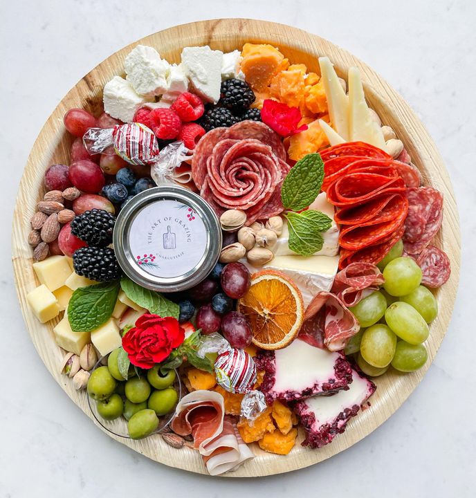 Ready-to-serve or gift! Charcuterie board for 4 with all the fixins. 5 Cheeses, salami rose, prosciutto, olives, jam/honey, grapes, berries, nuts and crackers packaged on the side for freshness.