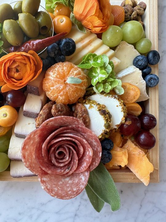 Ready for your holiday table! Charcuterie board for 10-12 with all the staples you know and love, plus plenty of festive red accents. 7 types of cheese, 2 salami roses, prosciutto, coppa, olives, cornichons, jam, honey, mustard, grapes, berries, nuts and crackers packaged on the side for freshness.