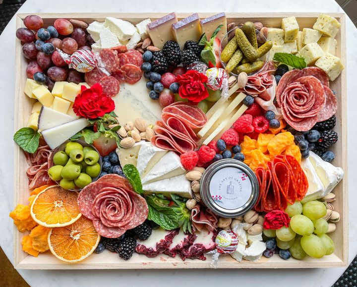 Ready-to-serve or gift! Charcuterie board for 10-12 with all the fixins. 7 types of cheese, 2 salami roses, prosciutto, coppa, olives, cornichons, jam, honey, mustard, grapes, berries, nuts and crackers packaged on the side for freshness.